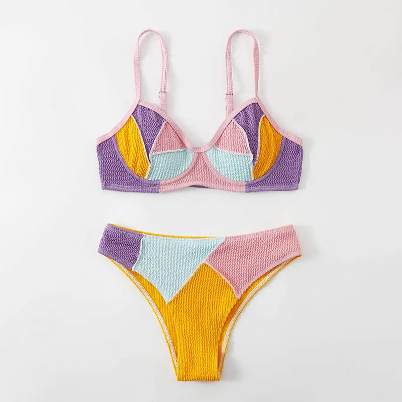 A classic underwire top with mould cup to get the shape and give you a custom fit. color block, overlock stitching on top, special crinkle fabric all make you special.