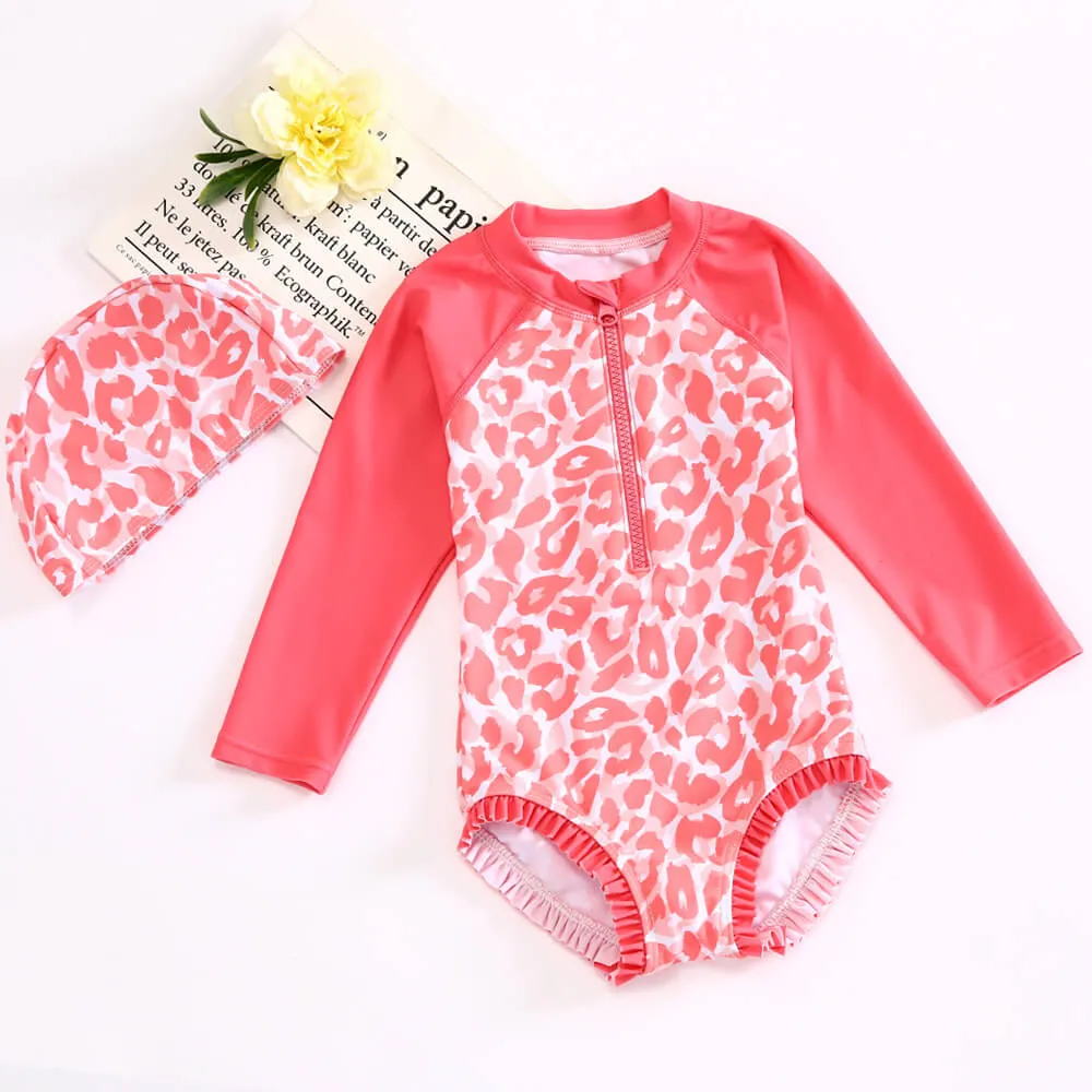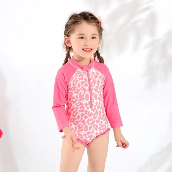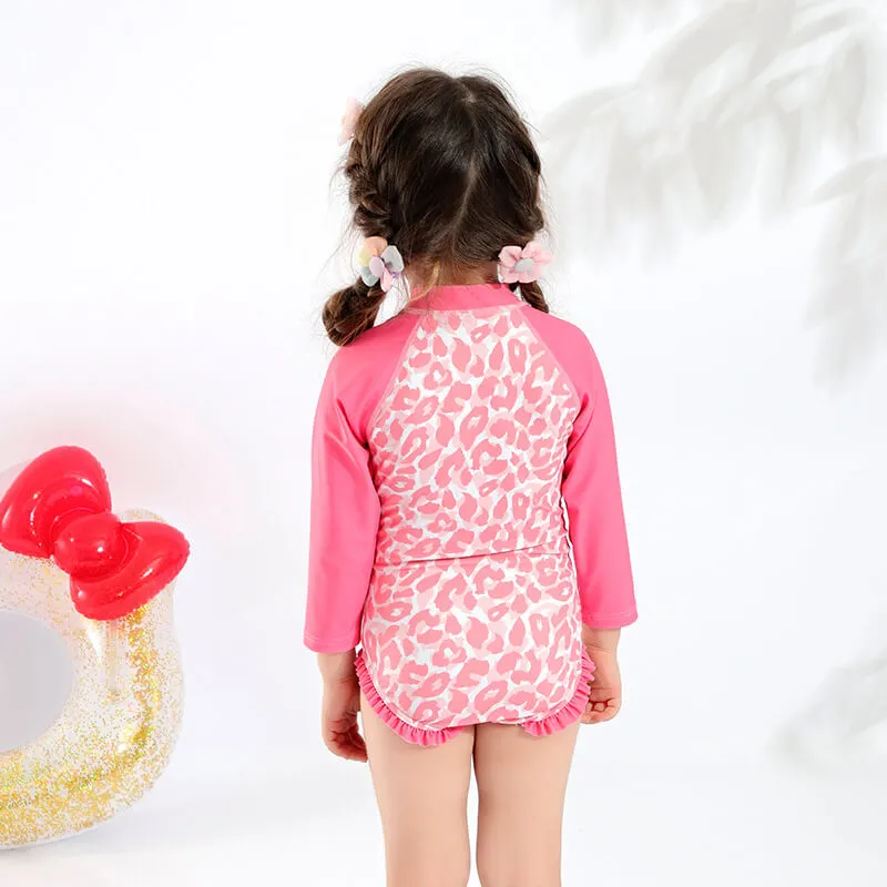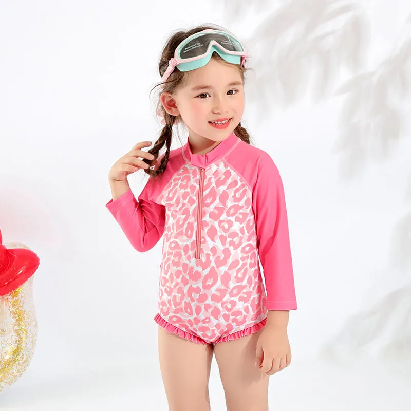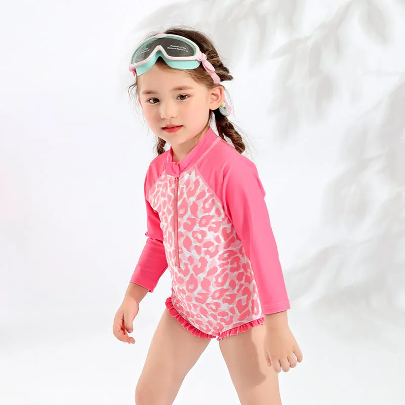 Long sleeve rash guard with zipper front, zipper end to protect the skin, allover printing on body and plain sleeve, frill on the legs.