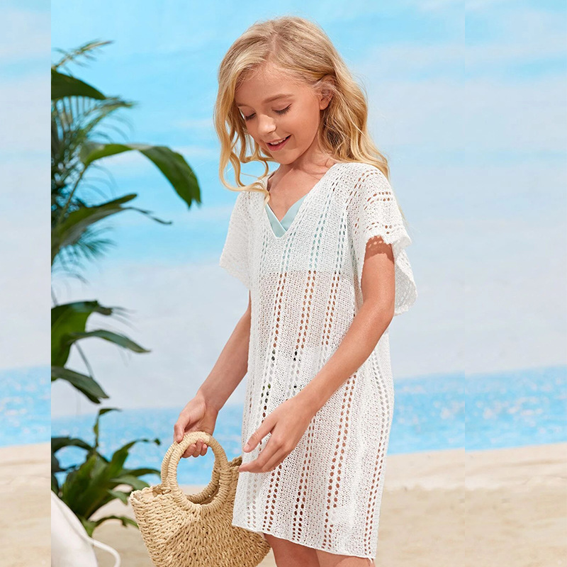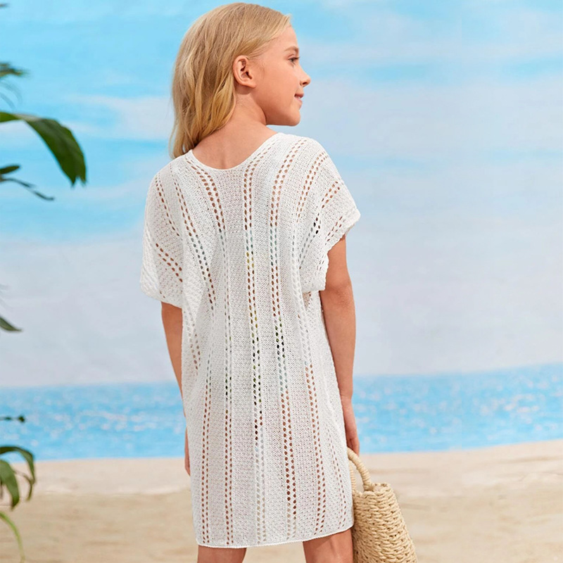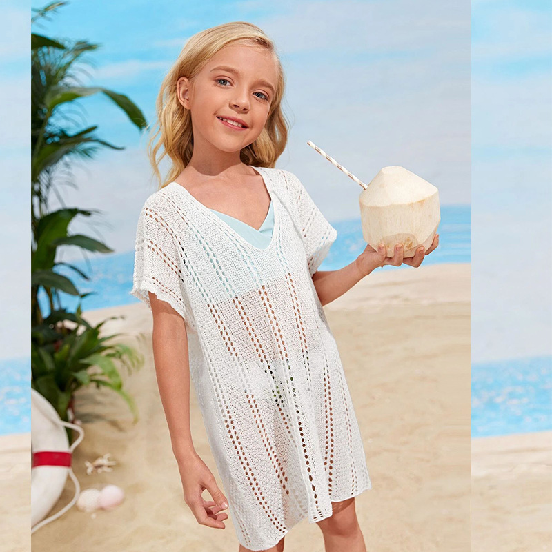 Girls Crochet Cover Up Cut Out V Neck Short Sleeve Swimsuit