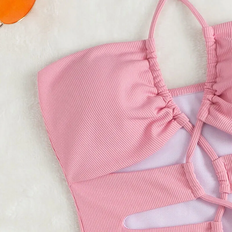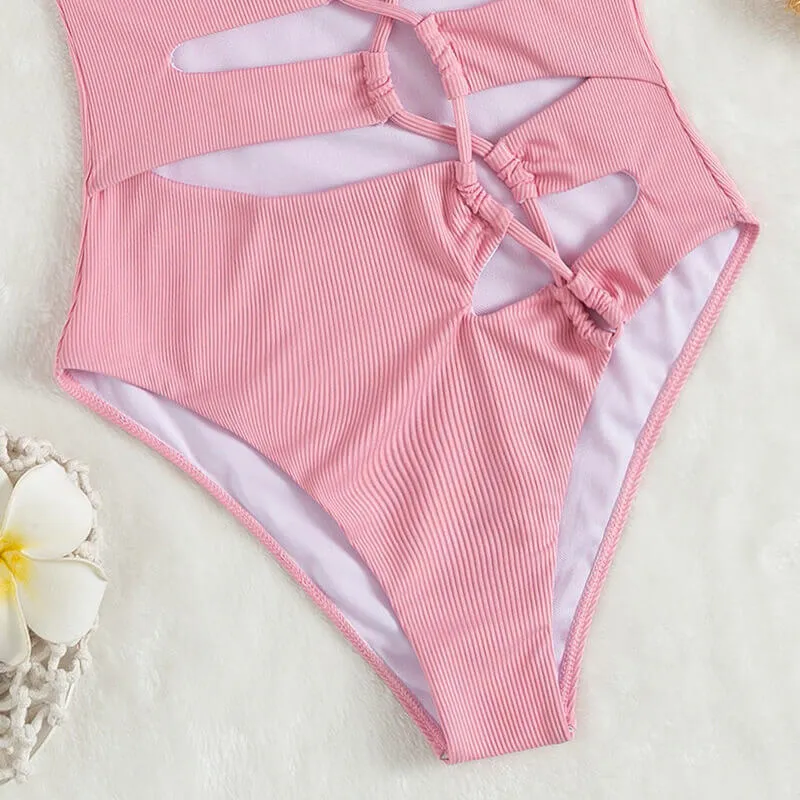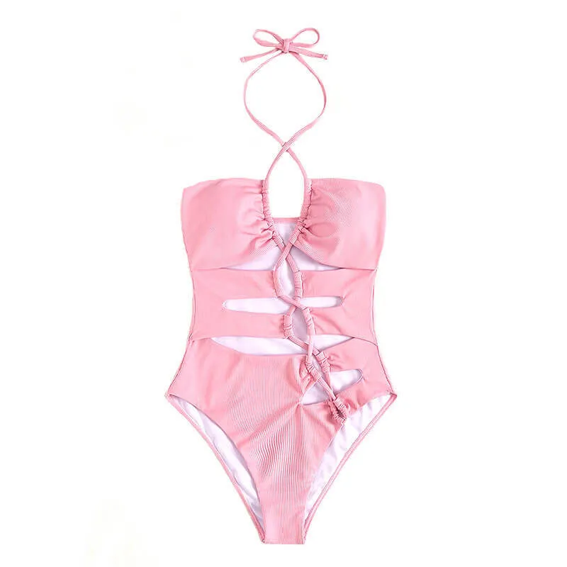 A aspried one piece made to get your fashion look, complete with bandage detail for the whole front, cut out design to look fashion again, halter at neck, rib fabric to have good feeling.