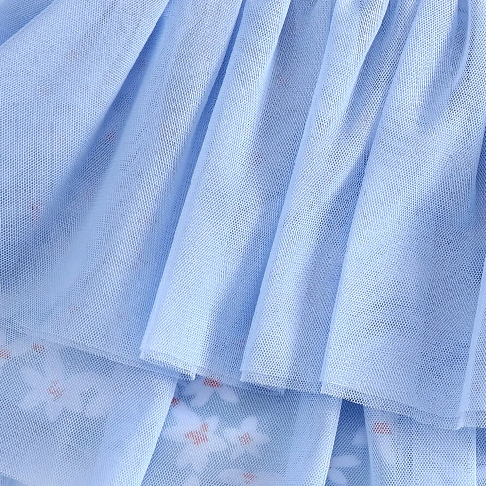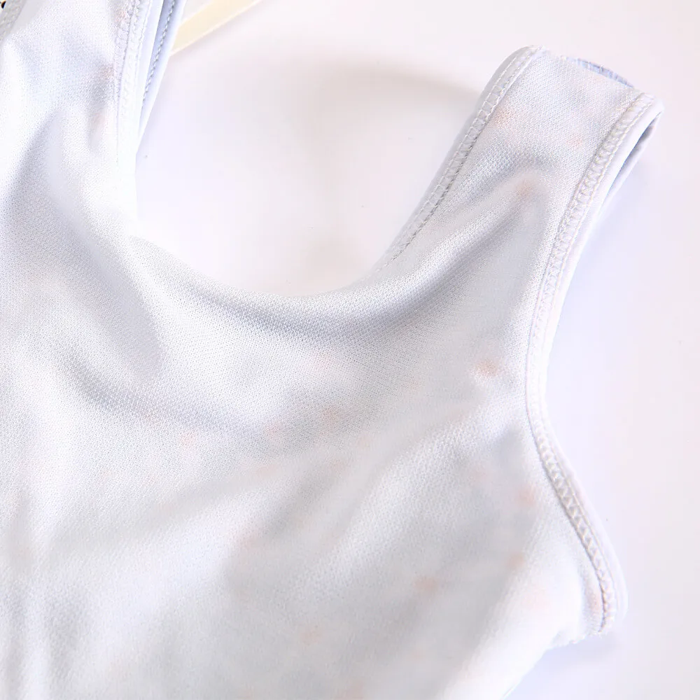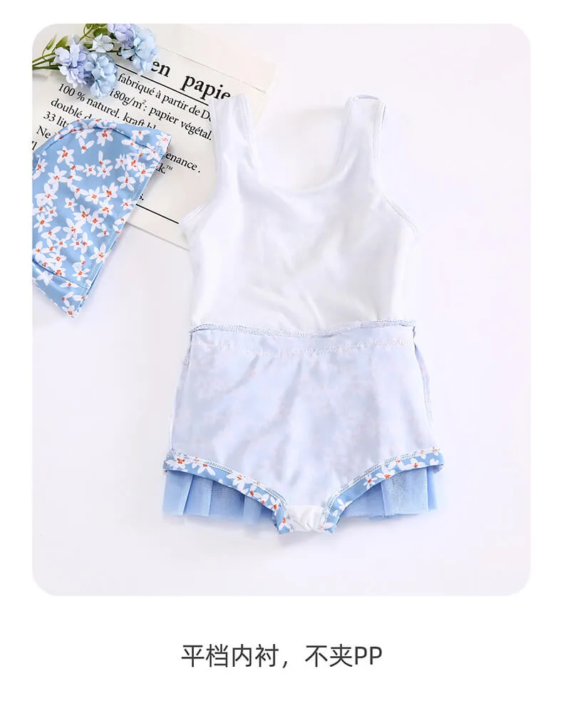 A classic one piece design with double layers mesh frills, flower printing on the body.