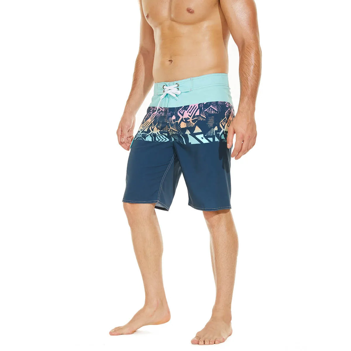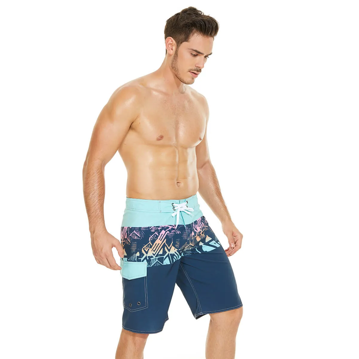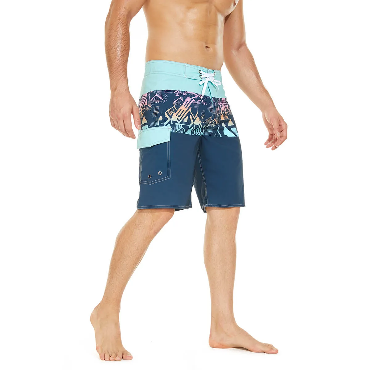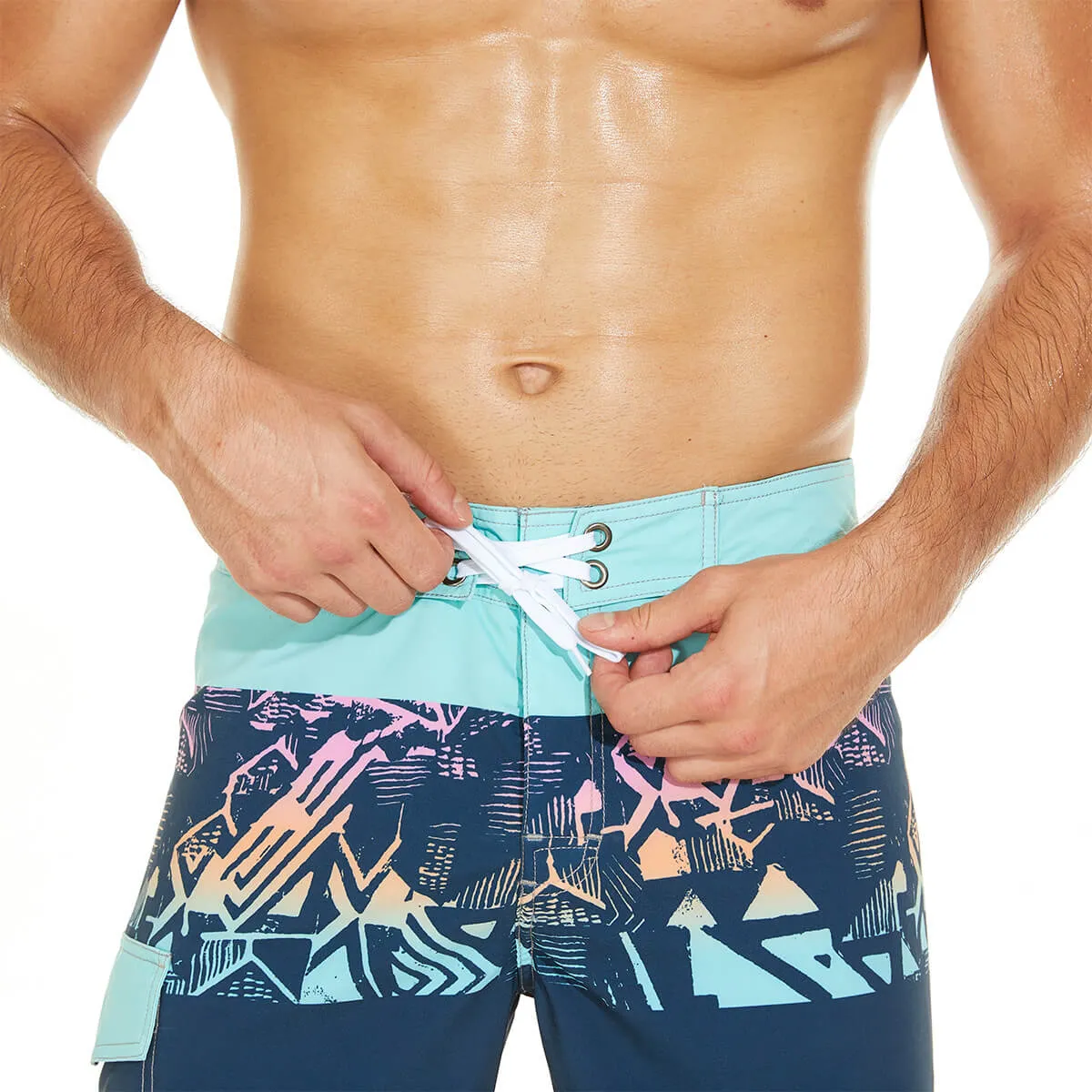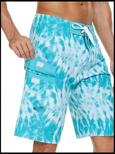 Surf boardshort with flap at waistband, real fly. Printing & plain block for this design with side pocket flap covered.