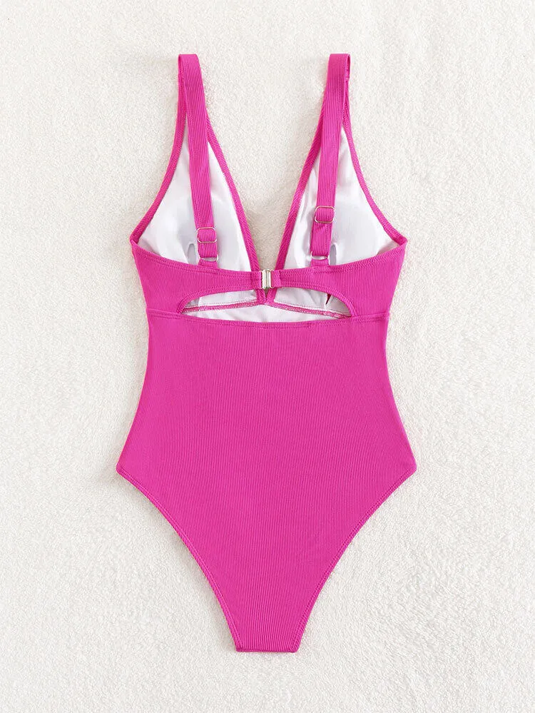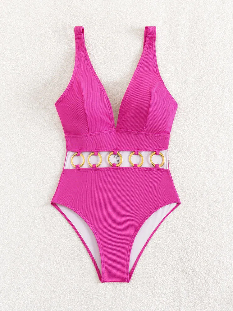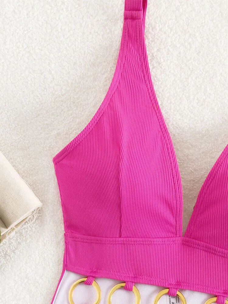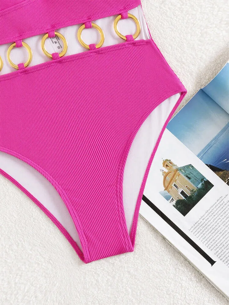 A aspried one piece made to get your fashion look, complete with 5 rings at front to joint the top and bottom, cut out at back, full coverage at cup, rib fabric to get good feeling.