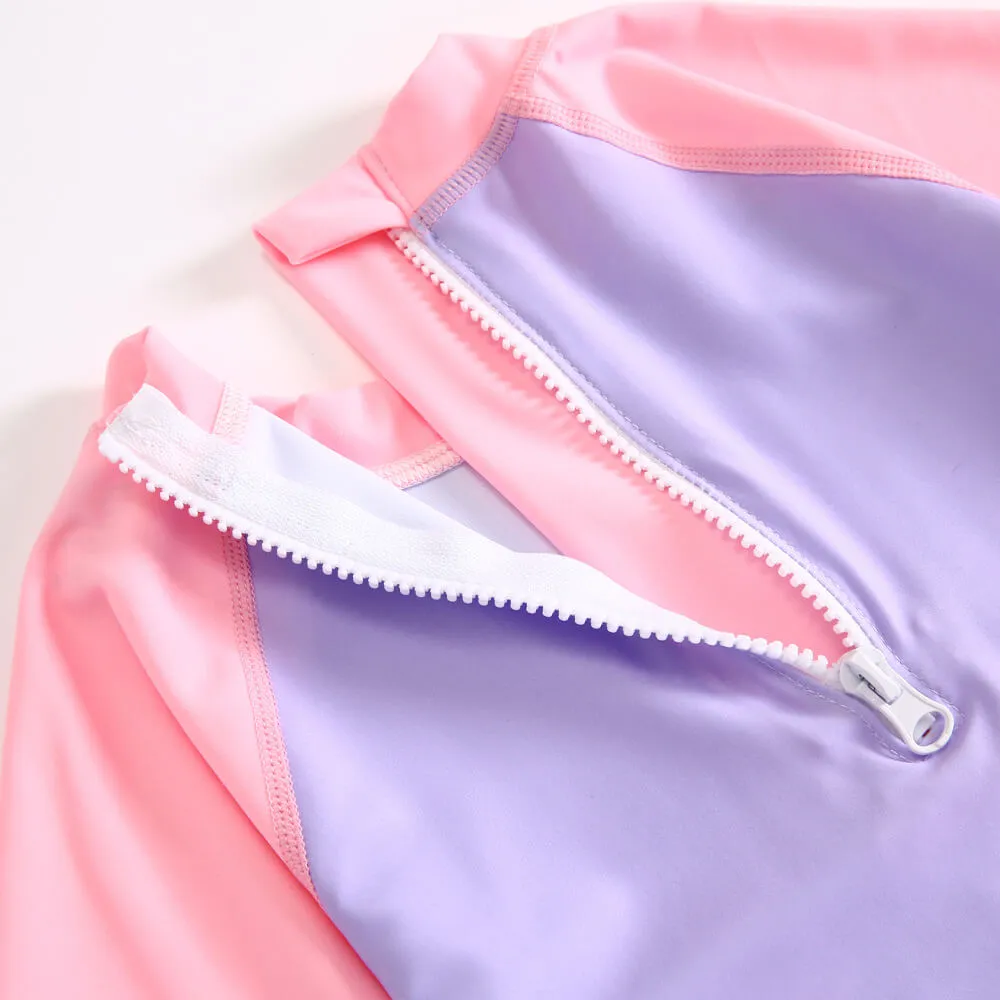 Full piece girl swimsuit with contrast sleeve and full printing on body.